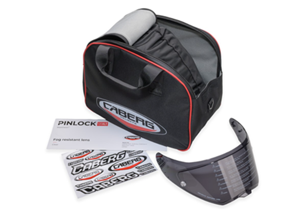 בקופסת הקרטון תמצאו תיק נשיאה מגניב שמתאים במיוחד לימי מסלול או טיסות לחו"ל, את הקסדה עצמה, משקף שקוף עמיד בפני שריטות, משקף נוסף כהה גם הוא עמיד בפני שריטות (שני המשקפים כוללים נקודות עיגון להתקנת עדשות tear-off להסרה מהירה, הנמכרות בנפרד), עדשת פינלוק 120 XLT שאותה מרכיבים בחלקו הפנימי של המשקף הראשי של הקסדה שמונעת אדים על המשקף בעת רכיבה בחורף, סנטרון לסגירת האזור שמתחת לסנטר ברכיבה בחורף, קיט מדבקות, וספרוני הדרכה. ניתן לרכוש גם משקף בעל כהות נמוכה יותר (40%), למי שרוצה.
