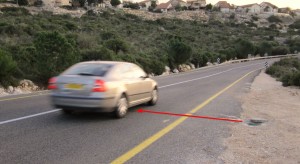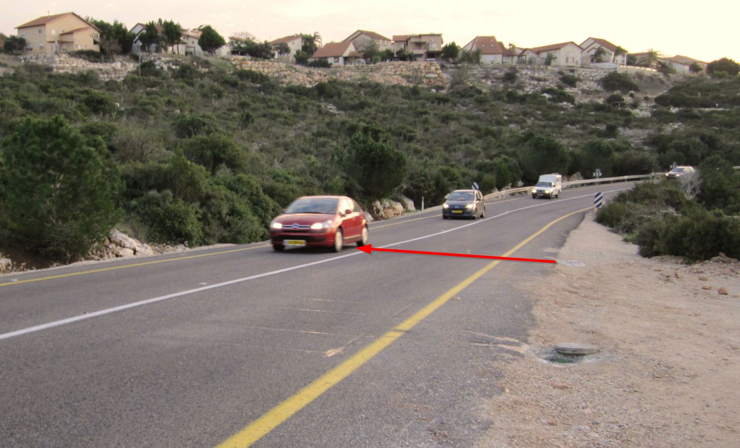 וכאן אנחנו רואים את הרכב המתקרב בנתיב הנגדי, גם הוא עולה על פסי הדריכה ומפעיל את המצלמה שתצלם את לוחית הרישוי הקדמית שלו. גם כאן החץ מצביע על פסי הדריכה: