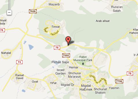 מצלמת מהירות גאטסו (כתומה) הוצבה על כביש 75, בצומת רמת-ישי לכיוון מערב. שימו לב, המצלמה מוסתרת היטב בין השיחים מיד לפני הצומת.