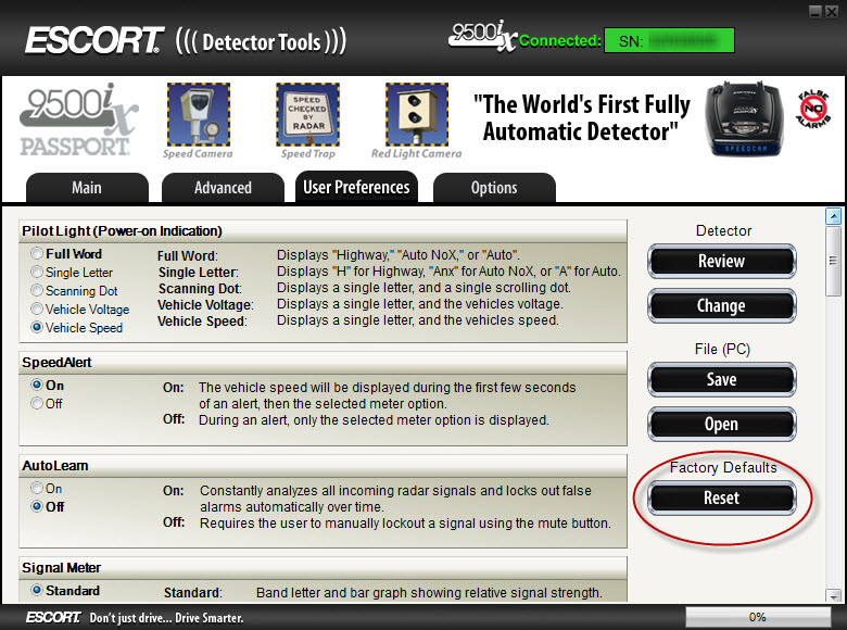 כדי לאפס את המכשיר להגדרות היצרן תוכלו לגשת ללשונית User Preferences ולאחר חיבור המכשיר – ליחצו על מקש Reset. לאחר האיפוס תוכלו לטעון מחדש את ההגדרות שלכם, אך נקודות העניין ששמרתם ימחקו גם הן.