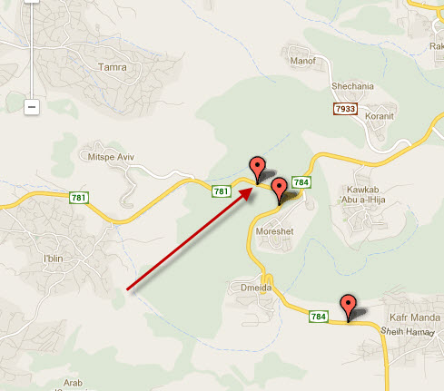 המצלמה החדשה מסומנת בחץ. במפה מתוארות גם שתי המצלמות הדו-כיווניות ה"ותיקות" על כביש 784.