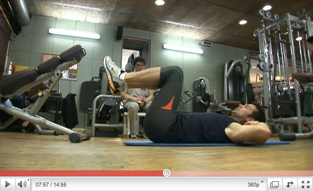 שוכבים במצב מוצא כמו בתרגיל 6. הגב וישבן צריכים להיות צמודים לארץ, בלי רווח. מרימים את שתי הרגליים בצורה צמודה לזווית של 90 מעלות ביחס לגוף, כשהברכים גם הן ב- 90 מעלות. הידיים משלבות אצבעות מאחורי העורף, אבל המטרה היא לא להרים את הראש אלא פשוט לשים את הידיים שם. עולים כמו בכפיפות בטן בערך חצי המרחק לכיוון הברכיים. בכל הזמן הזה הברכיים לא זזות מנקודת המוצא שלהן. חוזרים על התהליך 20 פעם.