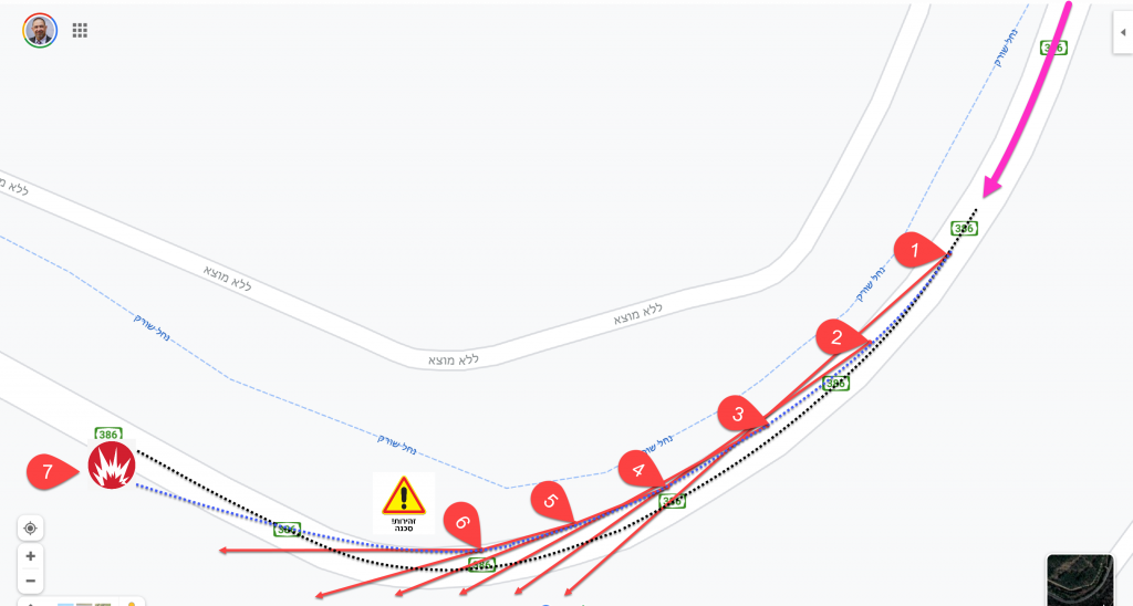 כפי שאתם יכולים לראות בתמונת הלווין שנלקחה מגוגל מפות של קטע כביש 386 בין הכיכר של עין כרם לצומת בר גיורא – כביש מפותל, כמעט אירופאי באופיו, אהוב במיוחד על רוכבים רבים – יש לפחות פניה מתהדקת אחת (בה אירעה התאונה המדוברת):