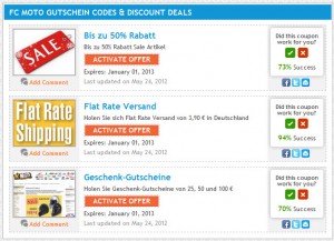 לדוגמה, חיפוש פשוט בגוגל מציג את הקופונים הבאים לאתר הפופולרי FC-Moto (לא נבדק, לשם המחשה בלבד):