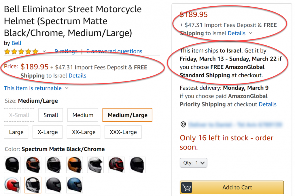 עידכון 2019: בכל קניה של מוצרים באמזון בעלות של מעל $75 תראו כיצד חישוב המחיר הסופי יכלול בתוכו גם את עלות המיסים, בצורה שקופה וקלה להבנה. כך יוצא שמה שאתם משלמים לאמזון כולל את הכל, ואתם יכולים להיות בטוחים שלא תצטרכו לשלם אפילו לא שקל אחד נוסף מעבר למה ששילמתם לאמזון. מצד שני, רכישת מוצרים (או קסדות) באתרים אחרים שאינם אמזון עדיין כרוכה, לעיתים, בתשלומים נוספים מרגע שהחבילה הגיעה ארצה. קחו את זה בחשבון.